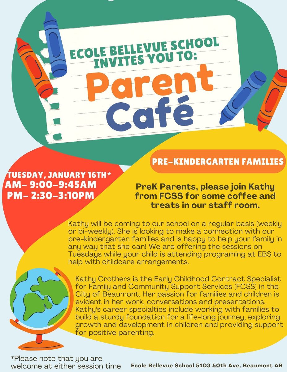 The first Tuesday Parent Café at École Bellevue School is scheduled for January 16, 2024, in the morning at 9:00 – 9:45 AM and the afternoon session runs from 2:30 – 3:10 PM. See poster for details.